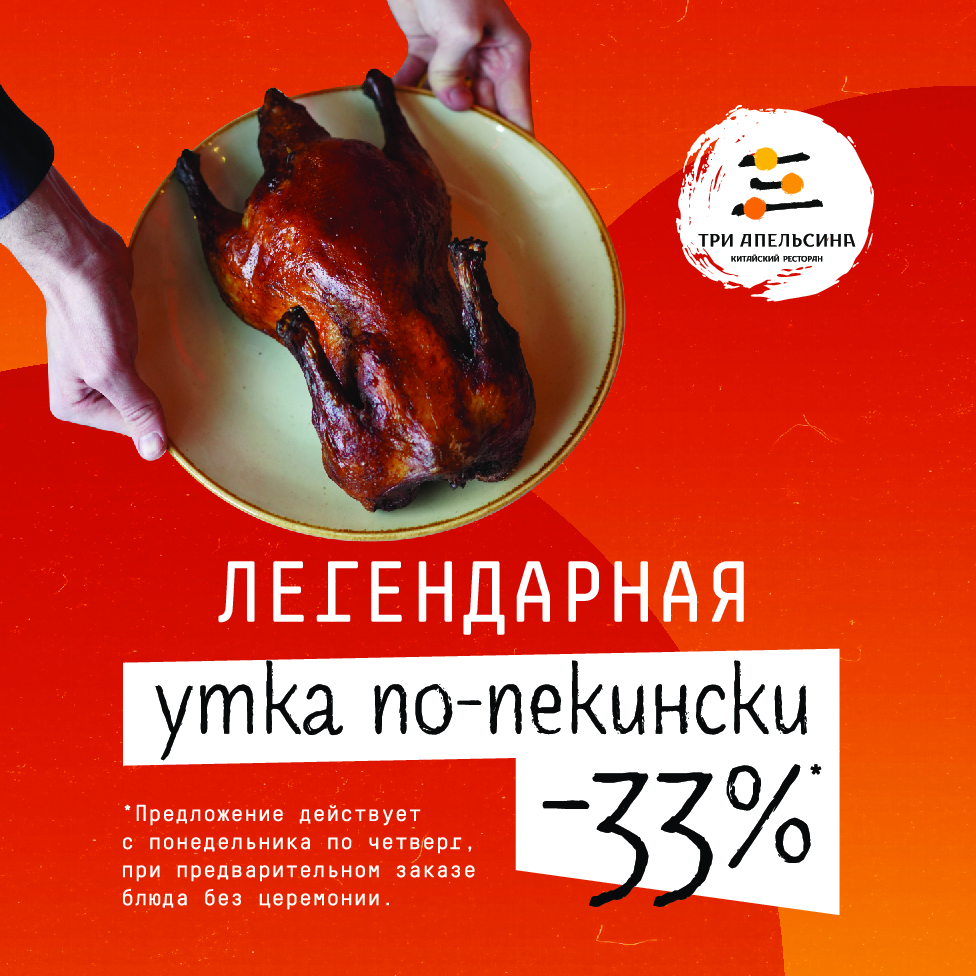 Только в «Три апельсина»- блюдо Китая по аутентичному рецепту. Акция действительна по предварительному заказу и бронированию даты визита с понедельника по четверг.